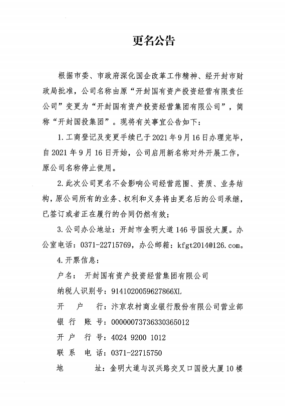 根據(jù)市委、市政府深化國(guó)企改革工作精神、經(jīng)開封市財(cái)政局批準(zhǔn),公司名稱由原“開封國(guó)有資產(chǎn)投資經(jīng)營(yíng)有限責(zé)任公司”變更為“開封國(guó)有資產(chǎn)投資經(jīng)營(yíng)集團(tuán)有限公司”,...